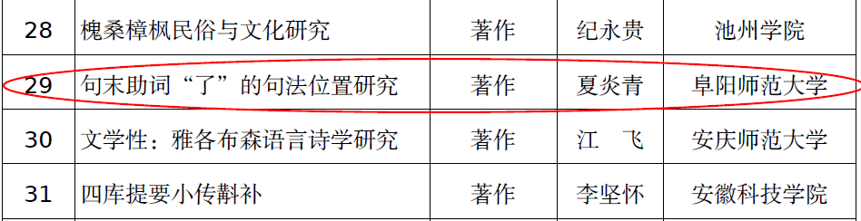 近日,省政府批复了2019—2020年度安徽省社会科学奖获奖成果,我院副教授夏炎青博士著作《句末助词“了”的句法位置研究》喜获安徽省社会科学三等奖。
