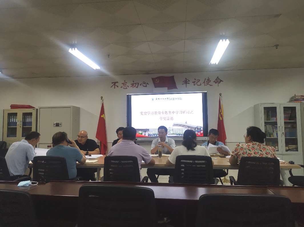 6月23日下午,外国语学院党委理论学习中心组举行专题集中学习会,开展“学史崇德”专题研讨。学院党委班子、党委委员、党支部书记、教研室主任、工会主席参加了学习会。会议由学院党委书记刘张飞主持,学院党委副书记戴亮、副处级党员干部谢娜、研究生秘书陈睿、专职辅导员赵雪志作主题交流发言。