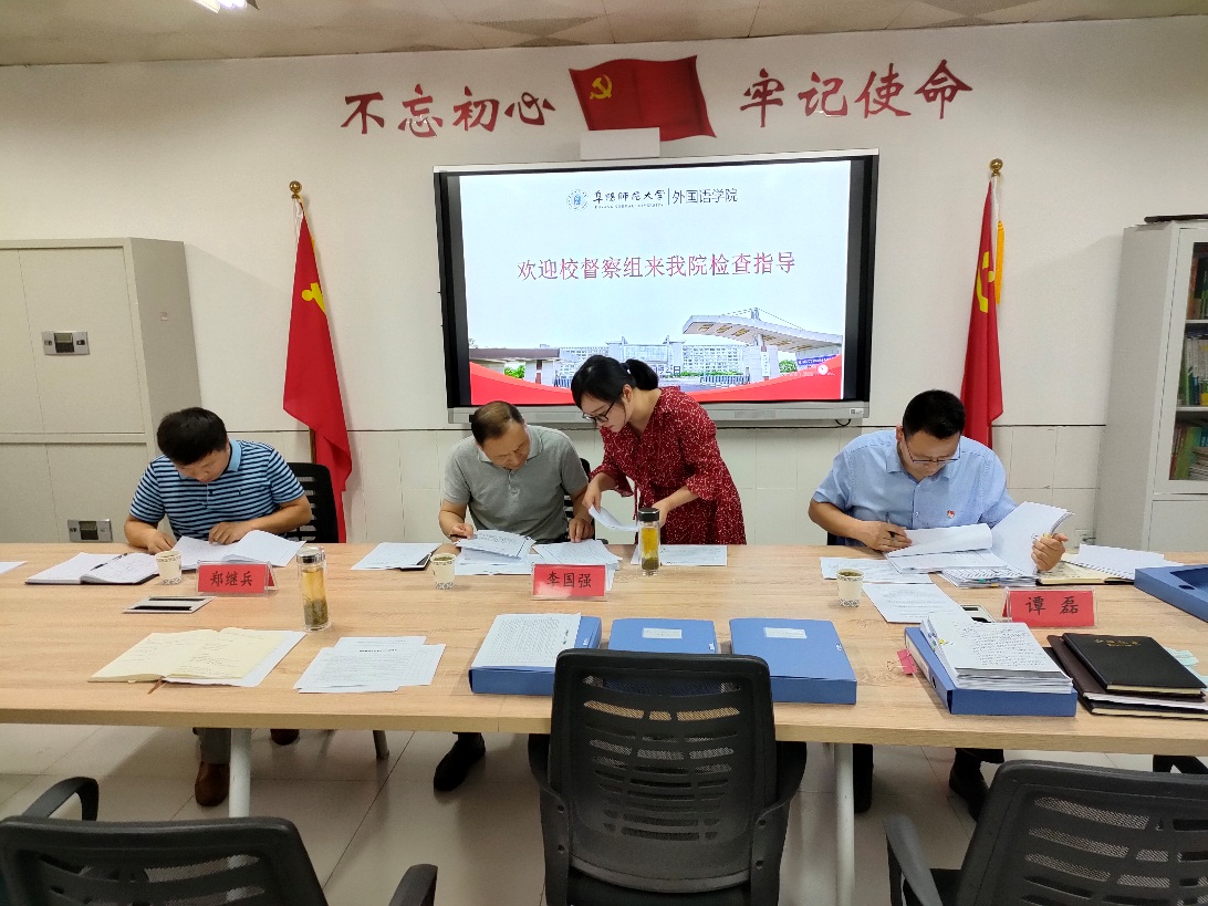 为切实推进学期重点工作任务落实,6月24日上午,校纪委副书记李国强、党委组织部秘书谭磊、教务处教研科科长郑继兵一行来外国语学院开展重点工作专项督查指导。