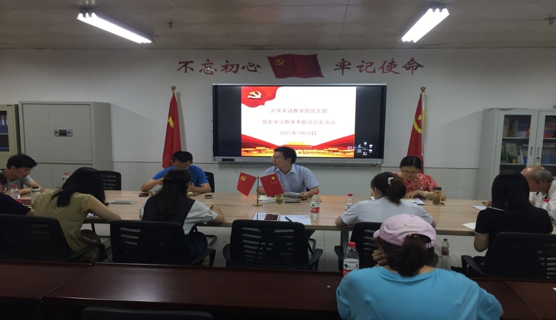 为扎实推进党史学习教育深入开展,7月15日上午,大学英语教学部党支部在景行楼816室召开党史学习教育专题组织生活会。学院党委书记刘张飞以普通党员身份参加会议,学院党委副书记戴亮列席指导。会议由党支部书记杨波主持,全体党员参加。