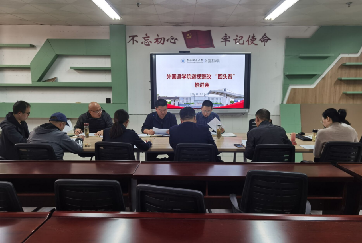 10月14日下午,外国语学院召开省委巡视“回头看”反馈问题整改专题推进会。学院党政领导班子成员、党支部书记、系部主任、党委秘书及联络员参会。会议由党委书记刘张飞主持。