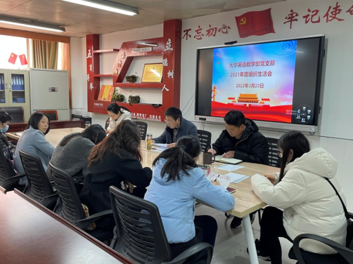 3月23日下午,大学英语教学部教师党支部在景行楼816会议室开展2021年度组织生活会暨民主评议党员。学院党委书记刘张飞以普通党员身份参加组织生活会,学院党委副书记、院长赵从义到会指导。会议由支部书记杨波主持。