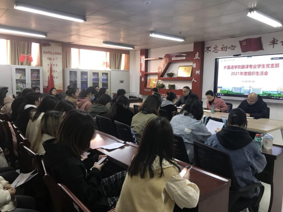 近日,翻译专业学生党支部召开2021年度组织生活会,全面盘点检视查找不足,开展民主评议党员工作。联系该支部的党委委员、副院长高福猛,学院本次组织生活会督导员、党委委员杨波出席会议,支部全体党员通过线上线下方式同步参会,会议由李奥运主持。