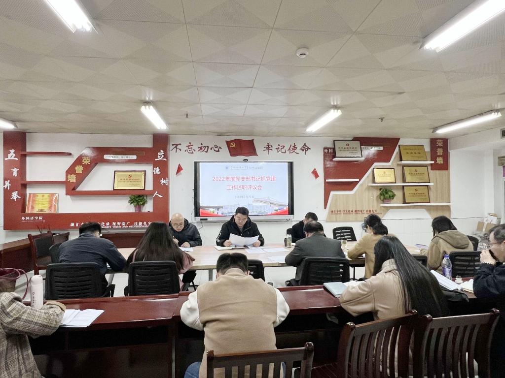 3月22日下午,外国语学院党委在景行楼816召开2022年度党支部书记抓党建述职评议暨“强基础、提质量、创品牌”三年行动计划工作推进会。学院党委班子、各党支部书记参加会议。会议由学院党委副书记、院长赵从义主持。