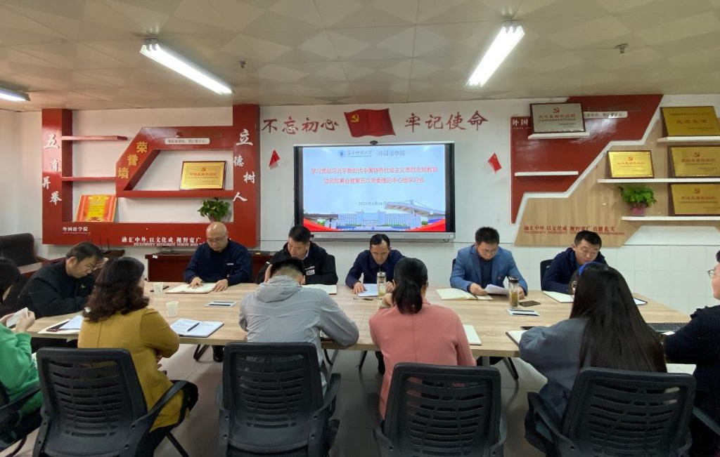 4月26日下午,外国语学院在景行楼816召开学习贯彻习近平新时代中国特色社会主义思想主题教育动员部署暨党委理论学习中心组集中学习会。宣传(统战)部部长王清到会指导,学院党委班子、支部书记、辅导员参加会议。会议由学院党委书记刘张飞主持。