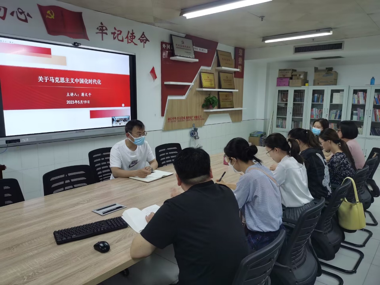 5月19日上午,翻译与日语系教师党支部书记蒋文干,以“关于马克思主义中国化时代化”为题,带领全体党员共同学习了习近平新时代中国特色社会主义思想的精神实质和科学内涵,要求支部党员深刻领会新思想的历史定位和深刻内涵。