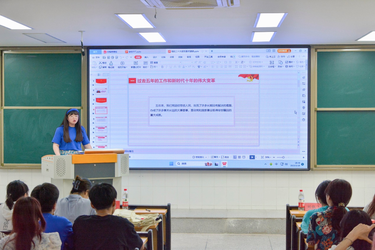 5月19日,日语与英语专升本专业学生党支部书记刘雨晴,围绕“学习二十大 奋进新征程”,在景行楼401教室向全体党员讲专题党课。