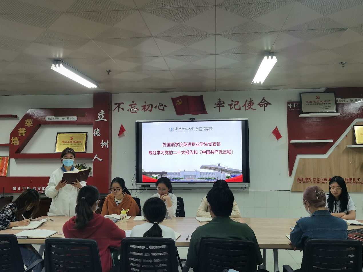 5月22日,英语专业学生党支部在景行楼816会议室,开展主题教育集中学习活动,党支部书记刘强强带领全体党员专题学习党的二十大报告和《中国共产党章程》,与会党员分别就前期个人自学的心得体会作了交流发言。