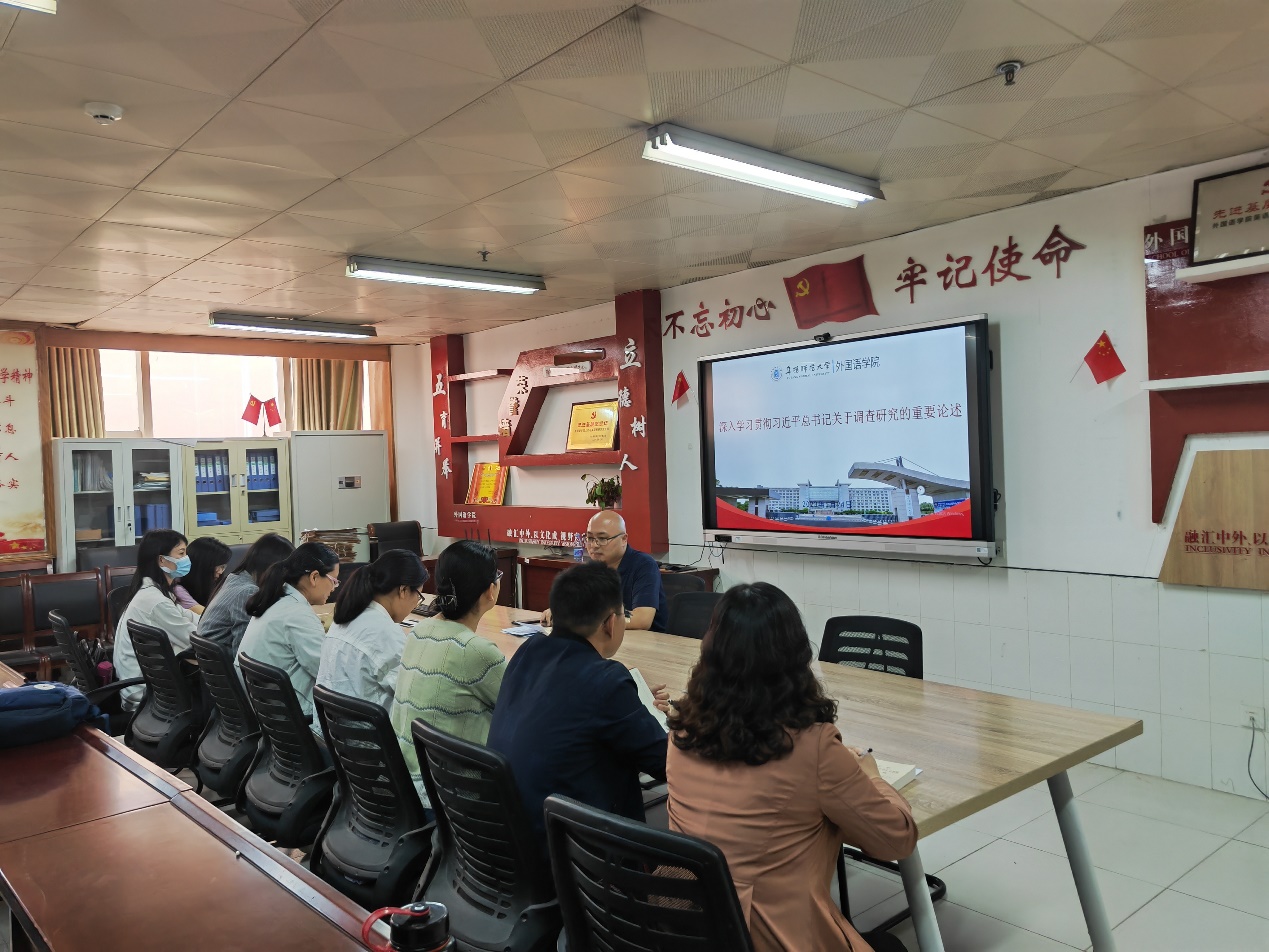 5月24日,学院党委委员、副院长高福猛,在景行楼816以“深入学习贯彻习近平总书记关于调查研究的重要论述”为题,向英语系教师党支部全体党员讲专题党课,要求支部党员切实提高思想觉悟,以高质量调查研究奋力推进学院高质量发展。