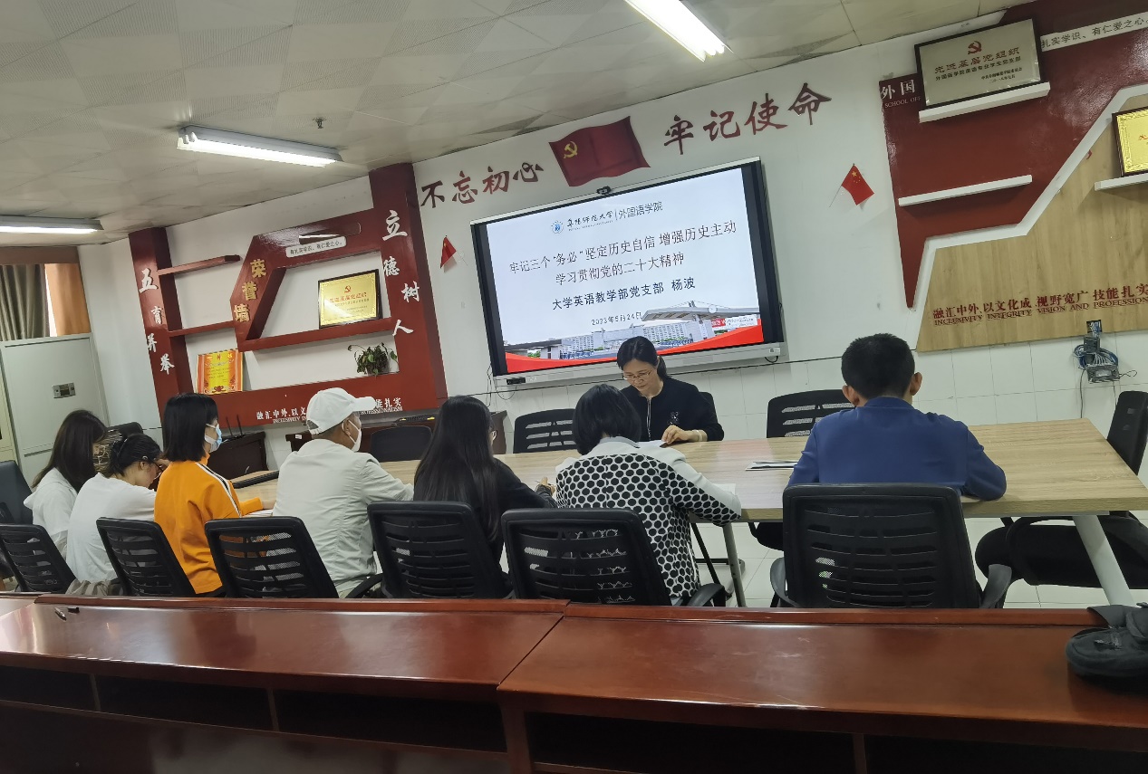 5月24日,外国语学院党委委员、大学英语教学部教师党支部书记杨波,以“牢记三个‘务必’ 坚定历史自信 增强历史主动 学习贯彻党的二十大精神”为主题,向支部全体党员讲授党课,号召支部党员用习近平新时代中国特色社会主义思想凝心铸魂、武装头脑。