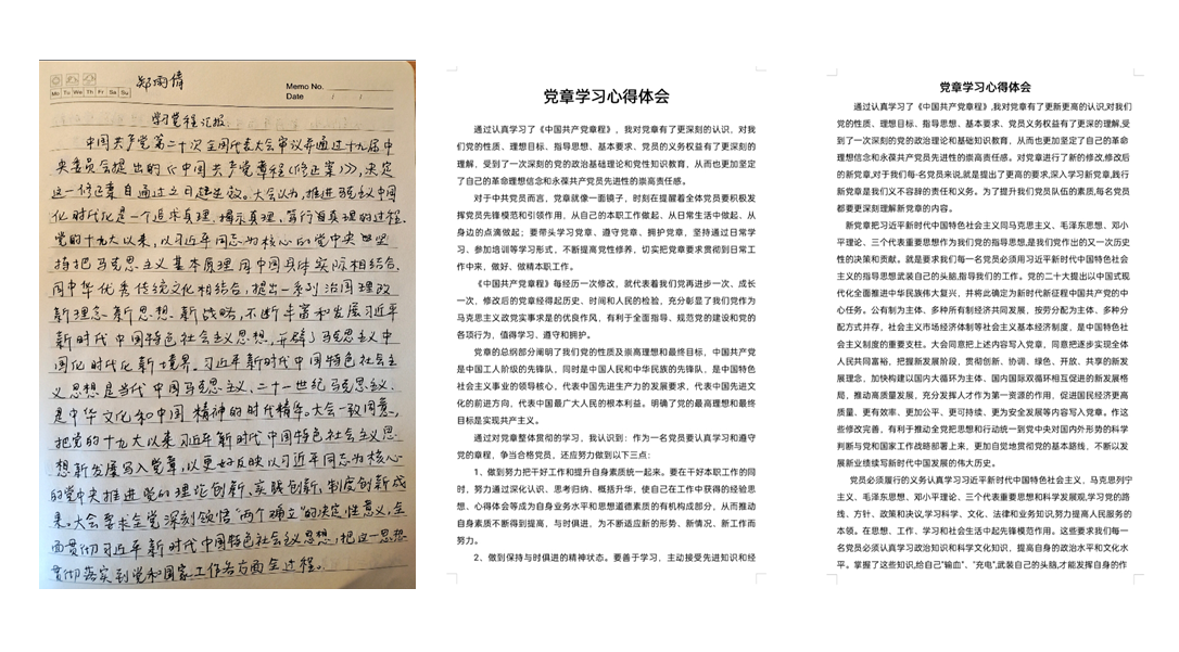 5月24日,研究生党支部组织支部党员开展党章中英文版自学活动,并就个人学习心得体会在支部工作群作了分享交流。