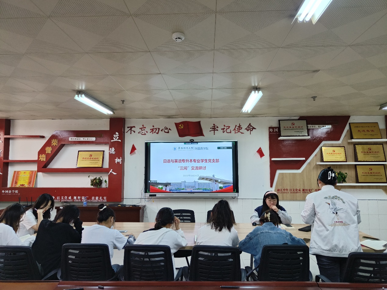 5月24日,日语与英语专升本专业学生党支部在景行楼816,组织支部学生党员围绕“三问”交流感想,对标自身学习、生活、思想,分享过去学的怎么样、现在干的怎么样、将来打算怎么办。会后,支部全体党员专题学习了《习近平著作选读》《习近平新时代中国特色社会主义思想专题摘编》中的重要思想理论,并就党的二十大报告和《中国共产党章程》进行了主题交流研讨,要求全体党员牢记“国之大者”,深刻领会“两个确立”、增强“四个意识”、坚定“四个自信”、做到“两个维护”。