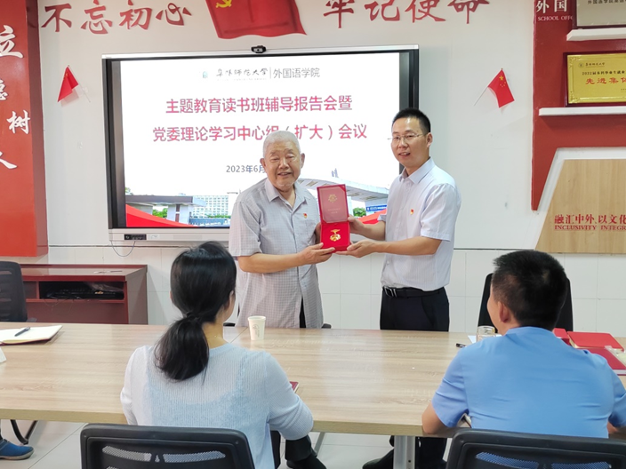 学院党委班子通过上门慰问走访等方式,向刘子臣、李福同两位光荣在党50年的老党员颁发了纪念章,表达了组织的节日祝福。李福同应邀参加学院主题教育读书班暨党委中心组学习会作专题党课。他追忆当年入党时场景,结合自己工作生活历程,畅谈了在党50年来的坚守理想信念、矢志拼搏奋斗心路历程,表达了为党的事业奋斗终身的决心;深情回顾了在外国语学院(外语系)工作美好时光,勉励全体党员同志们要从牢记教育报国的初心使命,为党育人、为国育才,落实“立德树人”根本使命,凝心聚力、踔厉奋发,扎实推动学院改革发展,建设高水平师范大学。