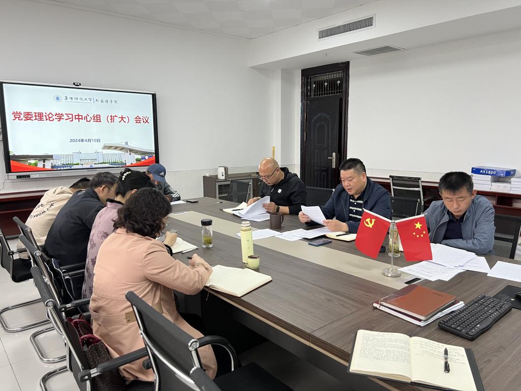 4月10日下午,外国语学院在景行楼802会议室召开党委理论学习中心组(扩大)会议,专题学习习近平总书记关于全面从严治党的重要论述,跟进学习习近平总书记最新重要讲话精神和重要指示批示精神,研究部署学院全面从严治党工作和党风廉政建设工作。学院全体党委委员、教师党支部书记、科级干部、行政秘书参加会议,会议由学院党委副书记戴亮主持。