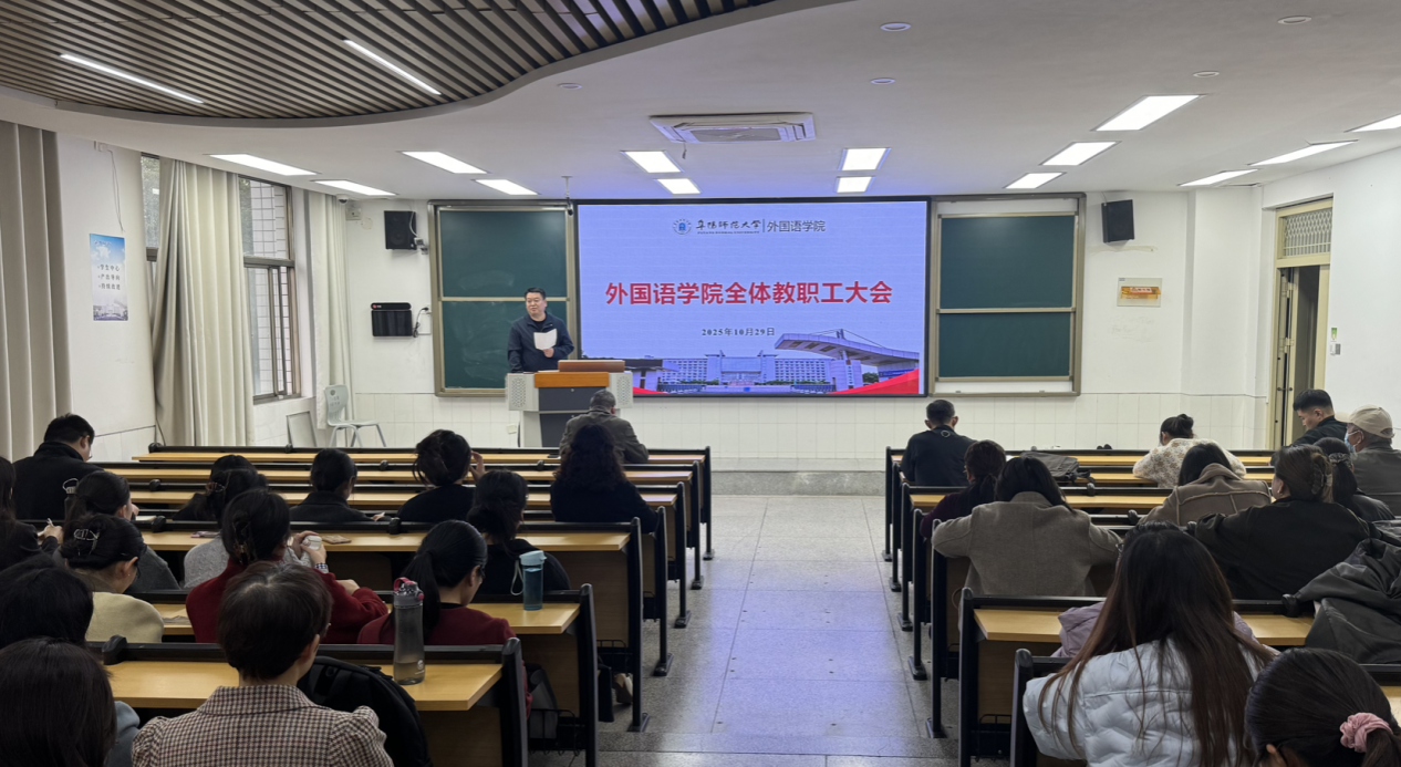 为学习贯彻党的二十届四中全会精神,将会议精神精准融入学院发展实践,10月29日下午,外国语学院在景行楼401教室召开全体教职工大会,集中学习党的二十届四中全会精神。会议由学院党委副书记、纪委书记王刚主持。