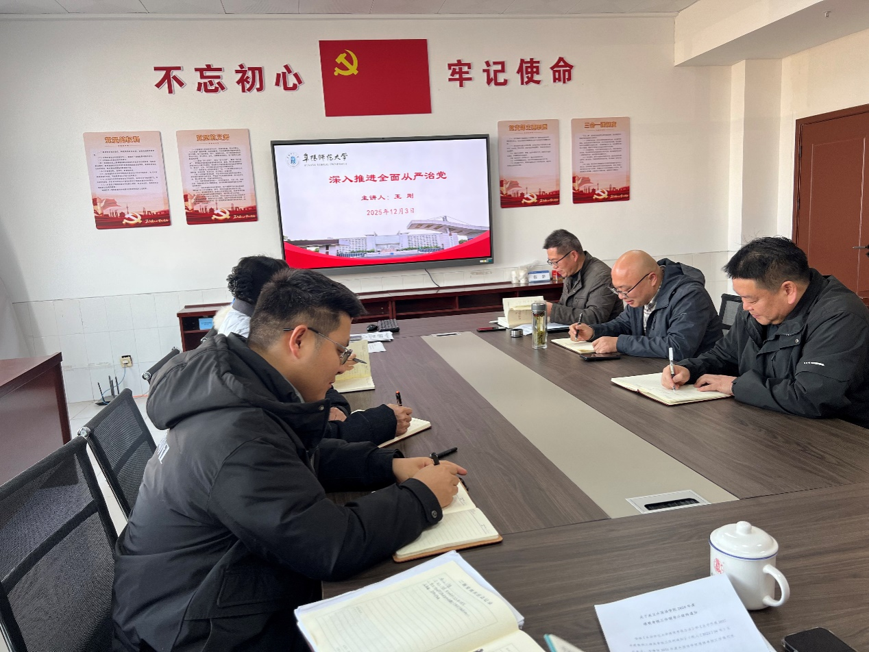 王刚领学了习近平总书记关于全面从严治党的重要论述,并以“深入推进全面从严治党”为题作辅导报告,同时就近期学院全面从严治党工作进行了安排和部署。