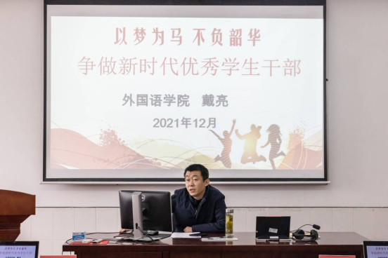 12月8日,戴亮走进学院“青马工程”培训班,为学生骨干讲授专题党课。报告以学习贯彻习近平总书记“七一”重要讲话精神为切入点,勉励广大学生骨干以梦为马、不负韶华、不负时代,做好一名优秀的学生干部,引领强国一代为实现中华民族伟大复兴贡献力量。