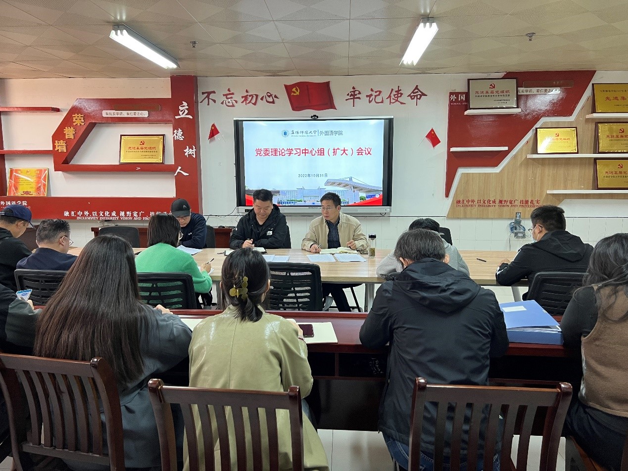 为持续深入学习宣传贯彻党的二十大精神,10月31日上午,外国语学院召开党委理论中心组(扩大)会议,专题学习党的二十大精神,研究部署学院学习宣传贯彻工作。学院党委书记刘张飞主持会议,学院党政领导、党支部书记、系部主任、科级以上干部及全体辅导员参加学习。