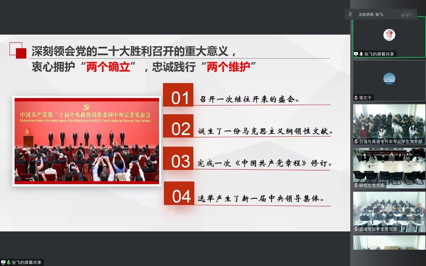 为深入学习宣传贯彻党的二十大精神,切实将思想和行动统一到党的二十大精神上来,11月26日上午,外国语学院举行学习贯彻党的二十大精神专题读书班暨党委书记讲党课活动。学院党委班子、各党支部支委班子、全体党员、发展对象、入党积极分子,以及“青马工程”培训班学员通过线上线下相结合的方式参加了会议。