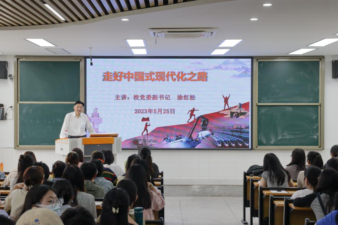 5月25日下午,校党委副书记涂红松深入教学一线,在西湖校区景行楼401教室为外国语学院2020级学生讲授了一堂精彩生动的形势政策课。