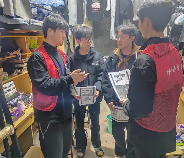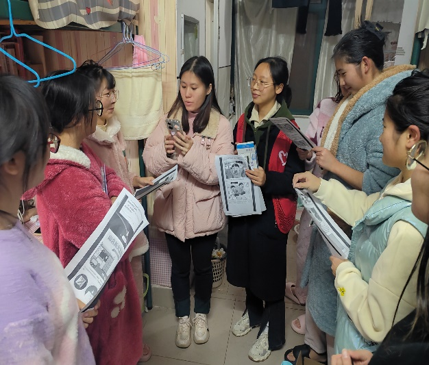 活动中,支部党员化身消防知识宣传员,为同学们发放消防安全知识宣传资料,通过图文展示与现场讲述相结合的方式,宣传不在宿舍存放易燃易爆物品、不使用违规电器、不在宿舍吸烟、不在宿舍要及时断电的宿舍防火“四不”要求。从宿舍防火怎么做、发生火情怎么办、火情逃生怎么走三个方面为同学们分享宿舍防火、灭火、逃生的科学知识和实用方法。带领同学们学习习近平总书记关于安全生产和消防工作重要论述、《高等学校消防安全管理规定》及校规校纪,引导同学们严格遵守宿舍消防安全管理规定。支部党员还围绕宿舍安全小常识开展互动有奖问答,同学们认真思考,积极踊跃回答问题,现场气氛活跃,大家纷纷表示要时刻关注消防安全,养成良好的生活习惯,共同维护和加强宿舍文化建设。