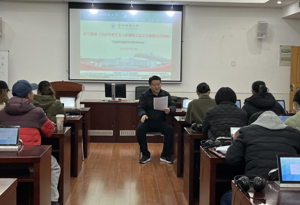 根据学院党委部署安排,为了进一步推动党支部建设和加强党员教育,外国语学院翻译与日语系教师党支部于2023年11月29日下午在景行楼503教室召开支部大会,集中学习习近平总书记最新重要讲话精神和关于工会工作的重要论述,支部全体党员参加,会议由支部书记蒋文干主持。