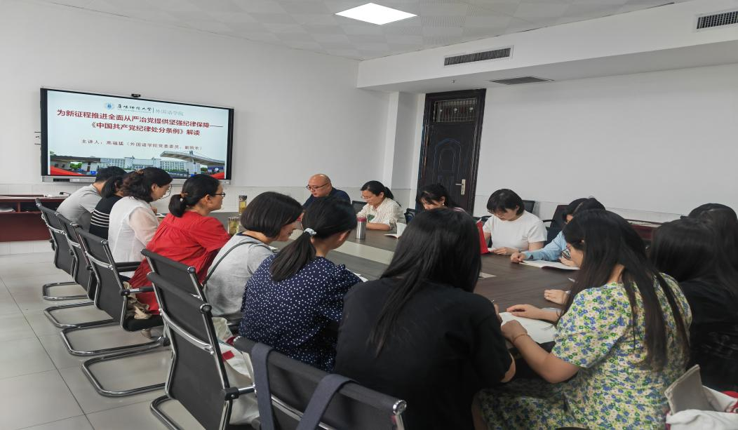 为深入学习贯彻《中国共产党纪律处分条例》,推进党纪学习教育走深走实,5月29日下午,外国语学院党委委员、副院长高福猛为英语系教师党支部全体党员讲党课,深入解读《中国共产党纪律处分条例》。专题党课由支部书记张艳主持,支部全体党员参加学习。