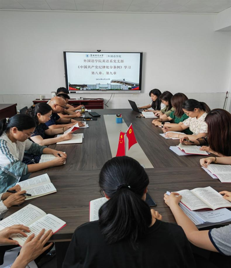 6月12日下午,英语系教师党支部在景行楼802会议室召开支部大会,集体学习《中国共产党纪律处分条例》第八章“对违反廉洁纪律行为的处分”和第九章“对违反群众纪律行为的处分”。会议由支部书记张艳主持,学院党委委员、副院长高福猛及支部全体党员参加学习研讨。