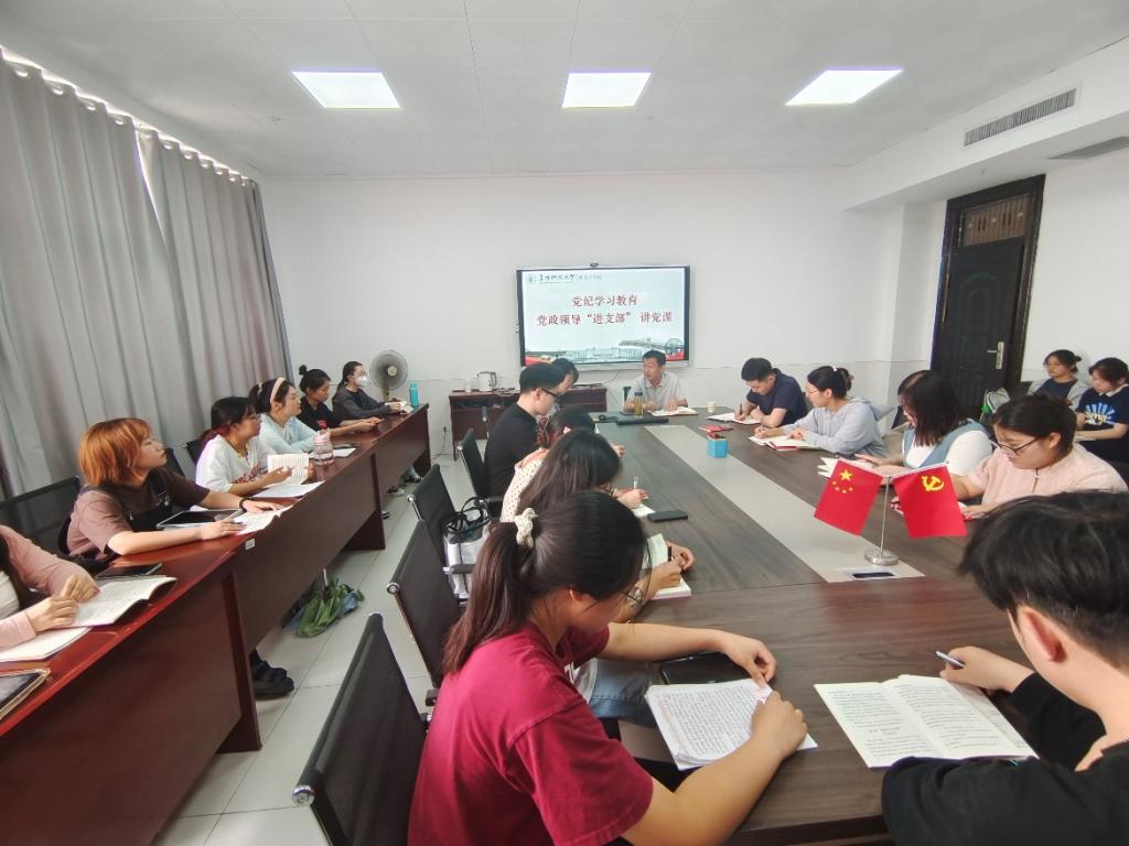 6月26日,外国语学院党委副书记、纪委书记戴亮深入联系学生党支部讲授党纪学习教育专题党课,指导学生党支部高质量开展党纪学习教育,进一步提高学生党员的政治觉悟和党性修养,强化学生党员纪律意识,筑牢思想防线。