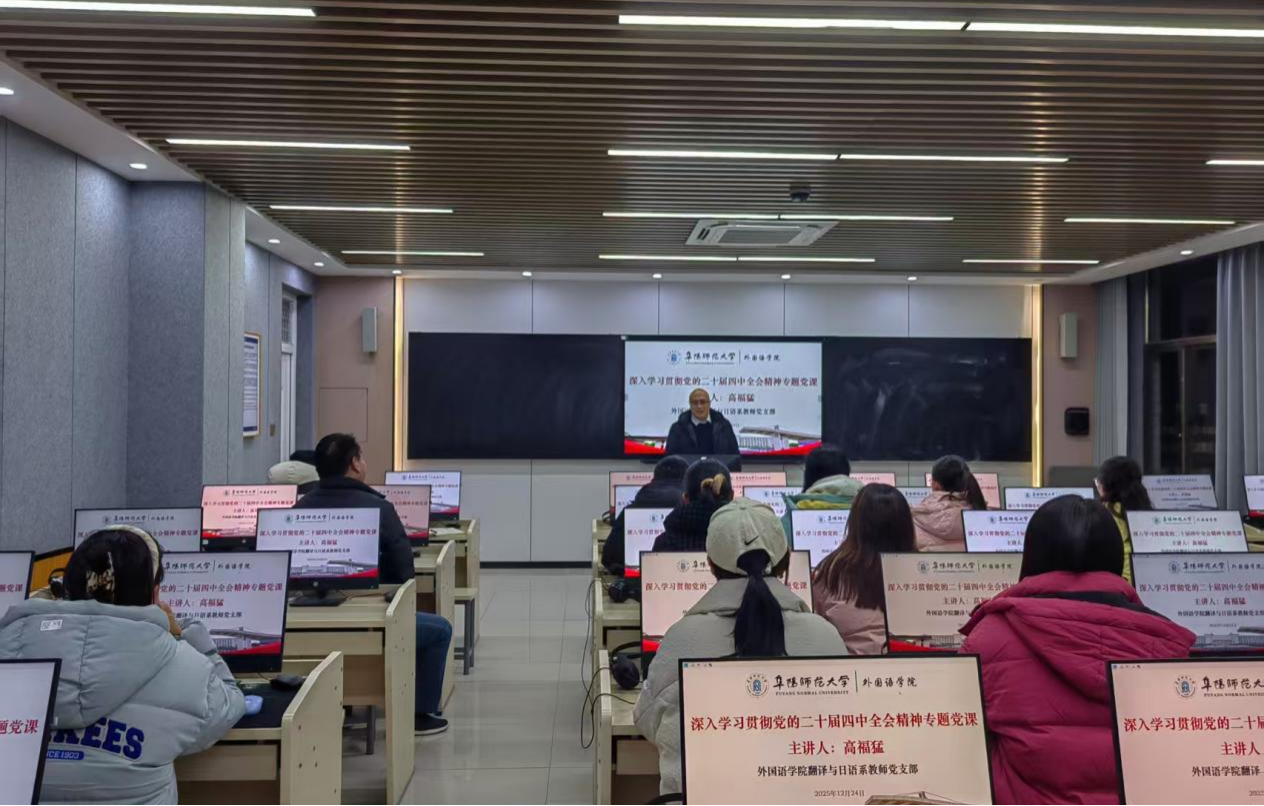 12月24日下午,外国语学院党委委员、副院长高福猛到联系支部——翻译与日语系教师党支部讲党课,党课围绕深入学习贯彻党的二十届四中全会精神开展。院党委副书记、院长赵从义以普通党员身份与支部全体党员一起参加学习。