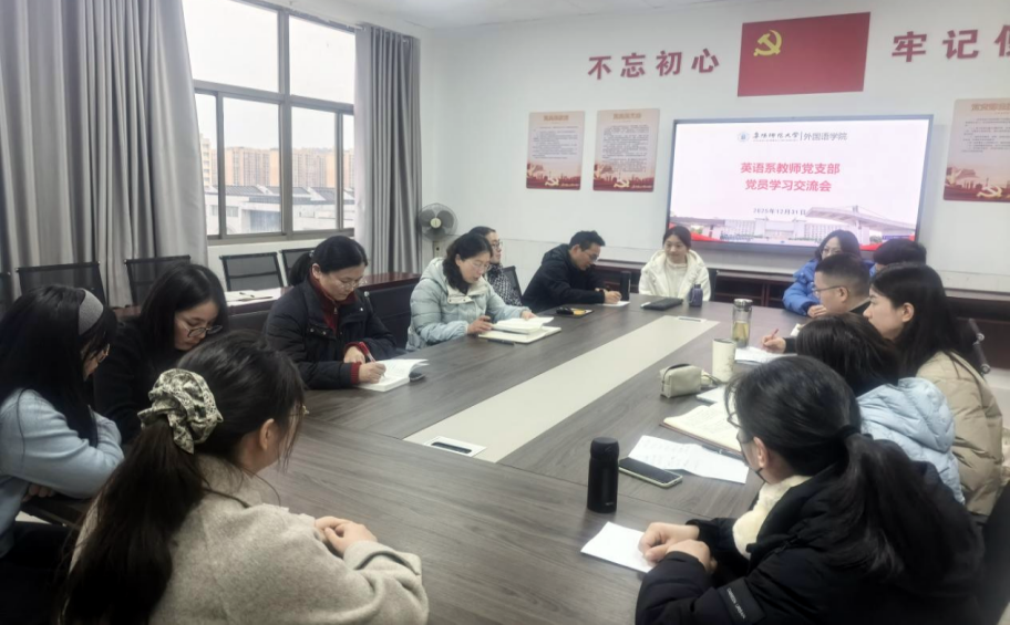 12月31日下午,英语系教师党支部在景行楼802会议室召开支部党员大会,深入学习贯彻习近平新时代中国特色社会主义思想,回顾总结2025年度工作。会议由党支部书记张艳主持,全体党员参会。