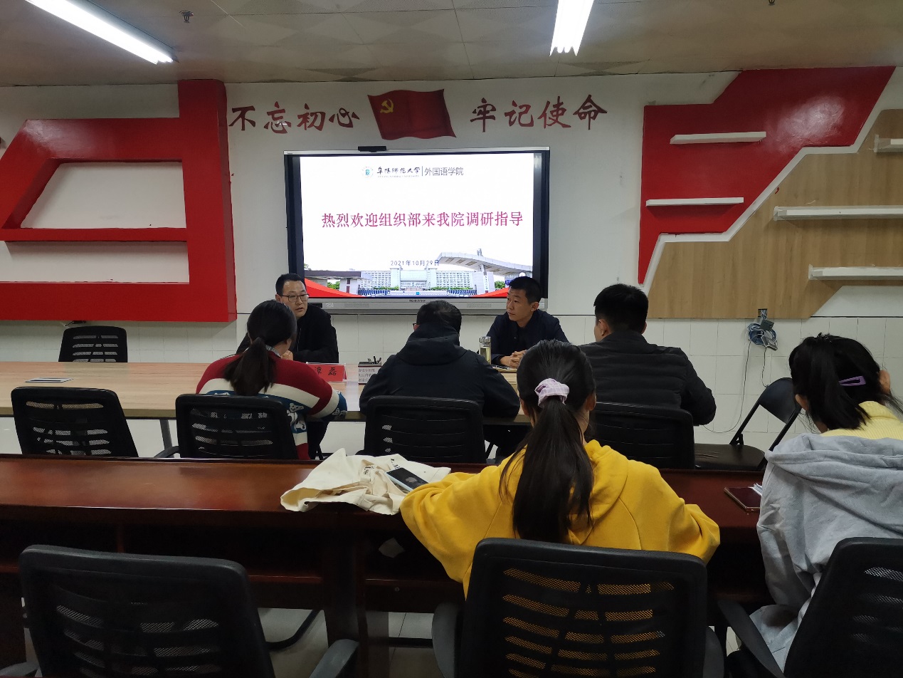 为扎实做好党史学习教育“我为师生办实事”实践活动,10月29日下午,外国语学院联合校党委组织部开展党员干部“进支部”,调研指导学生党支部建设,推动支部战斗堡垒作用发挥。校党委组织部副部长谭磊、外国语学院党委副书记戴亮、各学生党支部书记及学生党员代表参加活动。