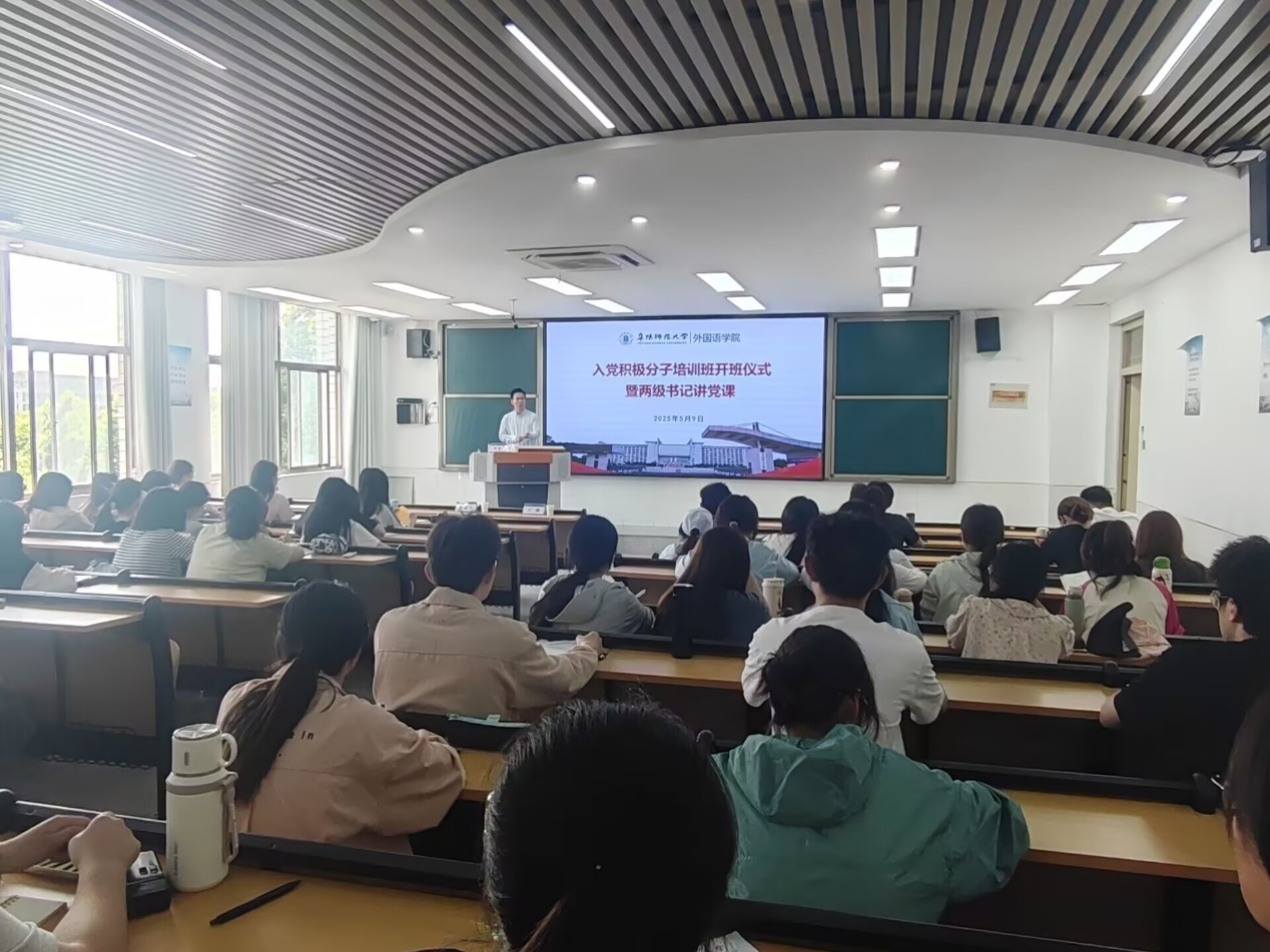 为扎实做好入党积极分子的培养教育,提高发展党员质量,5月9日下午,外国语学院2025年上半年入党积极分子培训班正式开班。学院党委书记刘张飞、党委副书记王刚,各学生支部书记以及68名参训学员参加。学院党委组织员刘雨晴主持开班式。