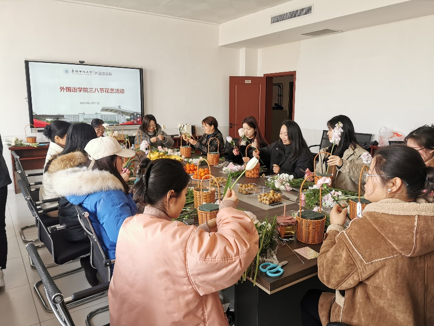 为庆祝即将到来的第115个国际劳动妇女节,丰富女教职工的业余文化生活,增强交流与沟通,外国语学院于3月7日下午开展了“喜迎三八节”插花体验活动,我院女教职工踊跃参与。
