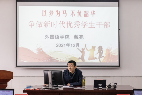 戴亮以“以梦为马,不负韶华——争做新时代优秀学生干部”为题,从“为什么会有学生干部”、“要不要担任学生干部”和“怎样当好学生干部”三个方面全面系统、深入浅出地阐述了新时代学生干部的角色定位、基本素养和培养路径。他提出,广大学生干部要科学全面地认识担任学生干部对自身成长发展的长远影响,结合工作实际,主动思考履职方法,科学培养履职能力,重点强化在“讲政治、重荣誉、明职责、有原则、善主动、能团结、爱学习、会沟通、敢担当”等方面的能力素质拓展,积极尝试模拟职场锻炼,在服务同学成长过程中促进个人健康成长,在服务学院和学校发展的过程中促进自己成为“想做事、能做事、做实事”的优秀学生干部。