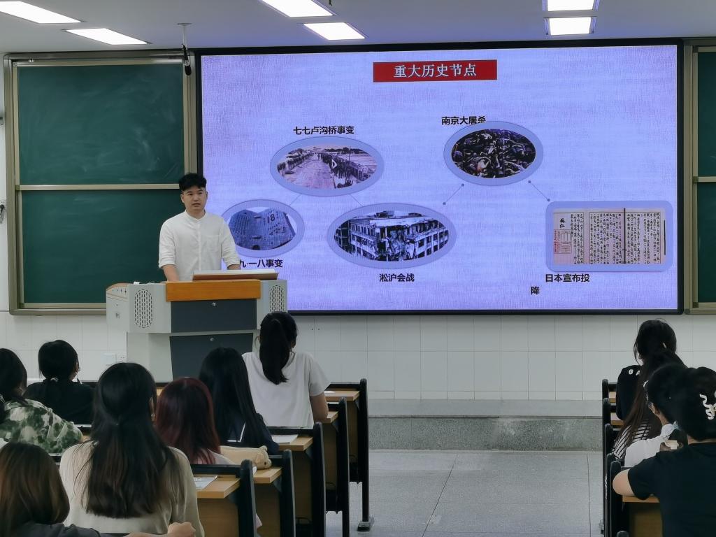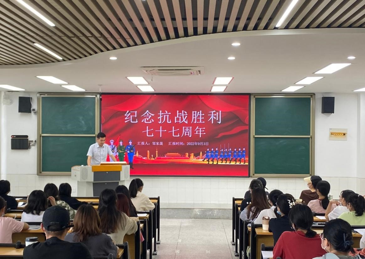 为纪念中国人民抗日战争暨世界反法西斯战争胜利77周年,弘扬以爱国主义为核心的抗战精神,凝聚勿忘历史、珍爱和平的广泛共识,9月3日上午,外国语学院分团校在景行楼组织开展“赓续抗战精神,砥砺复兴力量”主题团日活动。活动由外国语学院团委负责人赵雪志主持,外国语学院退伍大学生代表邹家晟、杨海洋担任主讲,各班级团员代表到场参与。