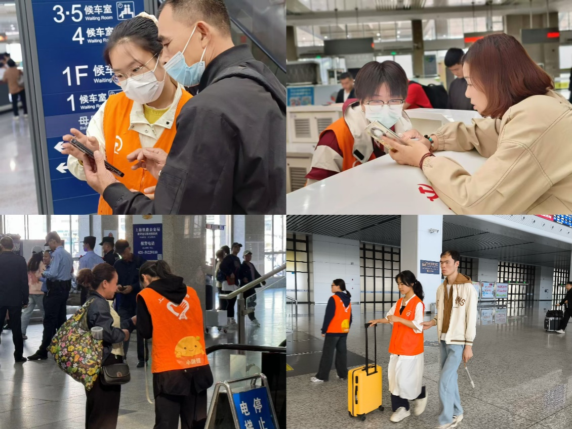 志愿服务,献礼祖国。“十一”国庆节假期期间,外国语学院组织30名志愿者前往阜阳西站和阜阳站开展了为期七天的志愿服务活动。志愿者们身着红马甲,为奔波的旅客提供路线引导、为有需要的乘客自助购票、取票,做好现场秩序维护等,以辛勤汗水解决旅客们的燃眉之急,用浓浓善意温暖步履匆匆的行路人,用实际行动诠释了“奉献、友爱、互助、进步”的志愿精神,用“志愿红”为“中国红”献礼。