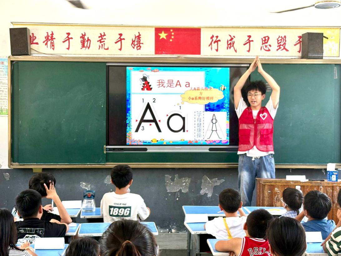 趣味英语进课堂,童心筑梦促振兴。志愿者们提前精心设计了字母教学、家人称呼英语教学以及颜色教学课程,在支教课堂上,志愿者采用趣味教学法,以“家庭聚会”“彩色世界探险”等情景导入,借助字母卡片、彩色玩偶等教具,让孩子们仿佛置身真实语境,轻松掌握英语知识,课堂气氛热烈,欢声笑语不断。