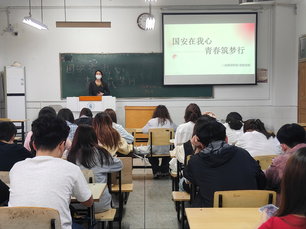 为深入学习贯彻总体国家安全观,增强青年学生的国家安全意识,外国语学院2023级英语专业5班团支部于近日成功举办了“国安在我心,青春筑梦行”主题团日活动。活动通过理论学习、案例研讨和互动实践等形式,引导同学们深刻认识国家安全的重要性,激发青年一代的使命担当。