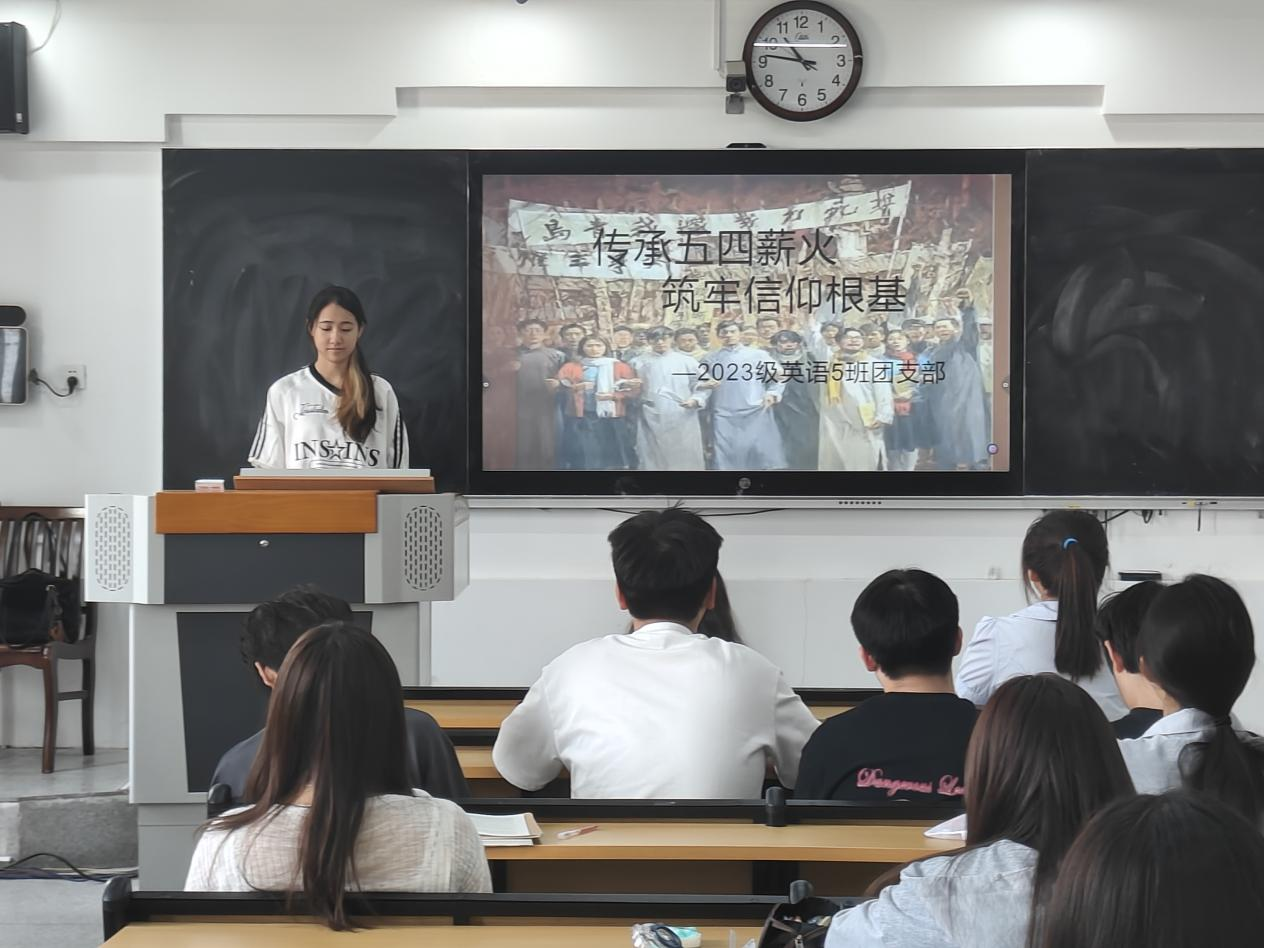 2025年4月29日,外国语学院2023级英语专业5班团支部在景行楼204开展“传承五四薪火,筑牢信仰根基”主题团日活动。此次活动由班级团支部书记黄静雯主持,旨在通过多种形式的活动,让团员青年深入了解五四运动的历史意义,深刻领会五四精神的内涵,激发团员青年的爱国热情,增强团员青年的历史使命感和责任感。同时,引导团员青年树立正确的世界观、人生观和价值观,坚定理想信念,将个人的成长与国家的发展紧密结合,为实现中华民族伟大复兴的中国梦贡献青春力量。