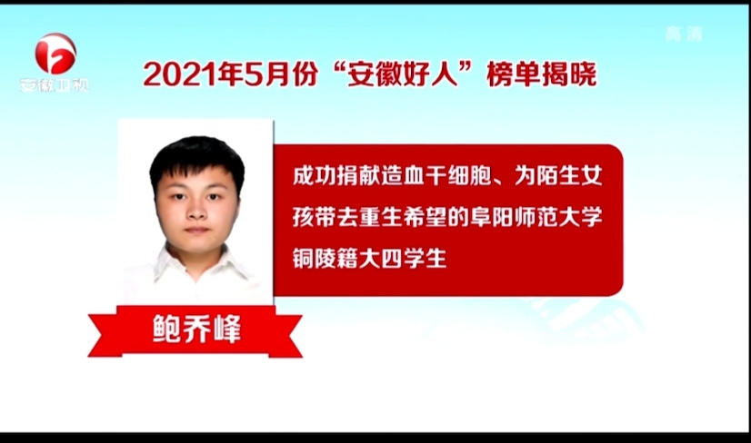日前,2021年5月份“安徽好人”评选结果揭晓,我校外国语学院鲍乔峰同学当选“安徽好人”,继获“铜陵市见义勇为先进分子”“铜陵好人”、第六届“铜陵青年五四奖章”等奖项后再获殊荣。