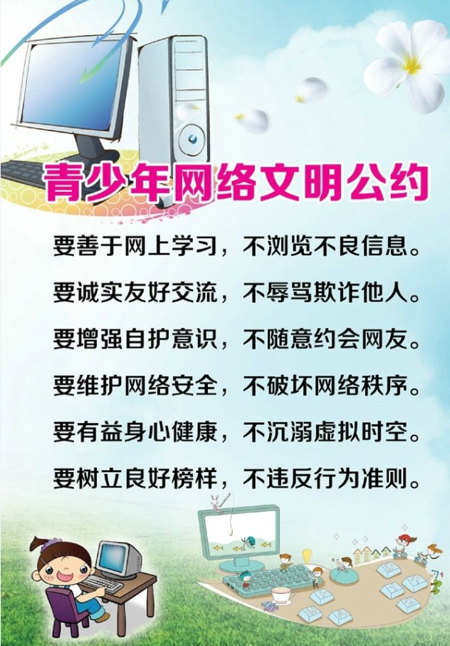 4.自觉增强网络道德意识,知荣辱、辨是非、施美德,坚持文明上网,自觉抵制任何形式的虚假、低俗信息,不信谣、不传谣、不造谣,不传播不健康的文字和图片;