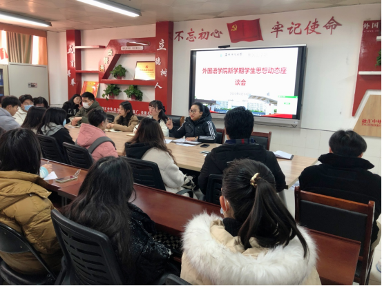 为及时、全面掌握返校后学生的思想动态与发展需求,切实加强新学期学生教育管理工作的针对性和实效性,2月24日下午,外国语学院召开专题学生座谈会,各年级辅导员、学生代表参加会议。学院团委负责人赵雪志主持会议。