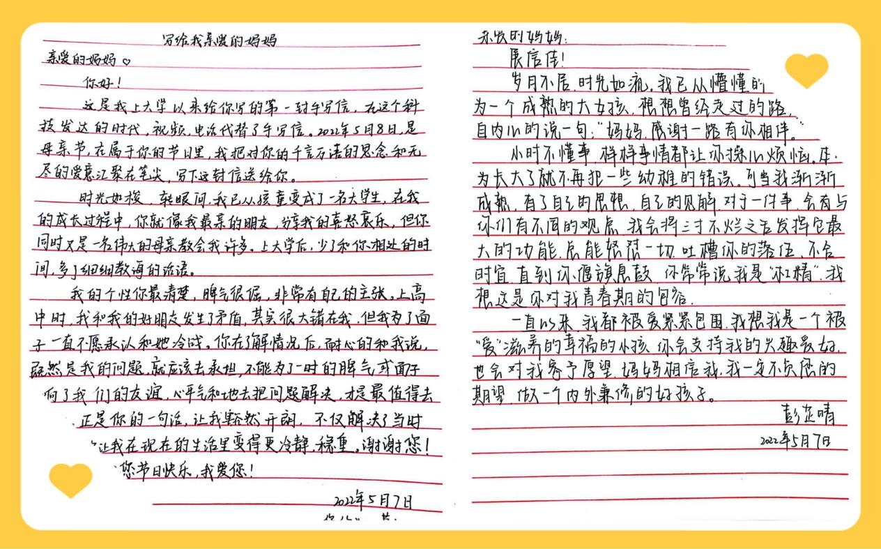 一封亲笔信,温暖传亲情。学生用细腻的笔触描绘了母亲的辛勤付出,表达了对母亲的由衷敬爱。“小时候总感觉说爱您很难,现在只想赖在您身边对您说千万遍;小时候总想着仗剑天涯,现在却只想赖在您的身边,细数年华。”一段段文字、一封封云端书信注入了学生们绵绵的深情,展示着与母亲的点点滴滴甜蜜回忆,表达着对母亲的节日祝福,传递着对母亲的爱与感恩。