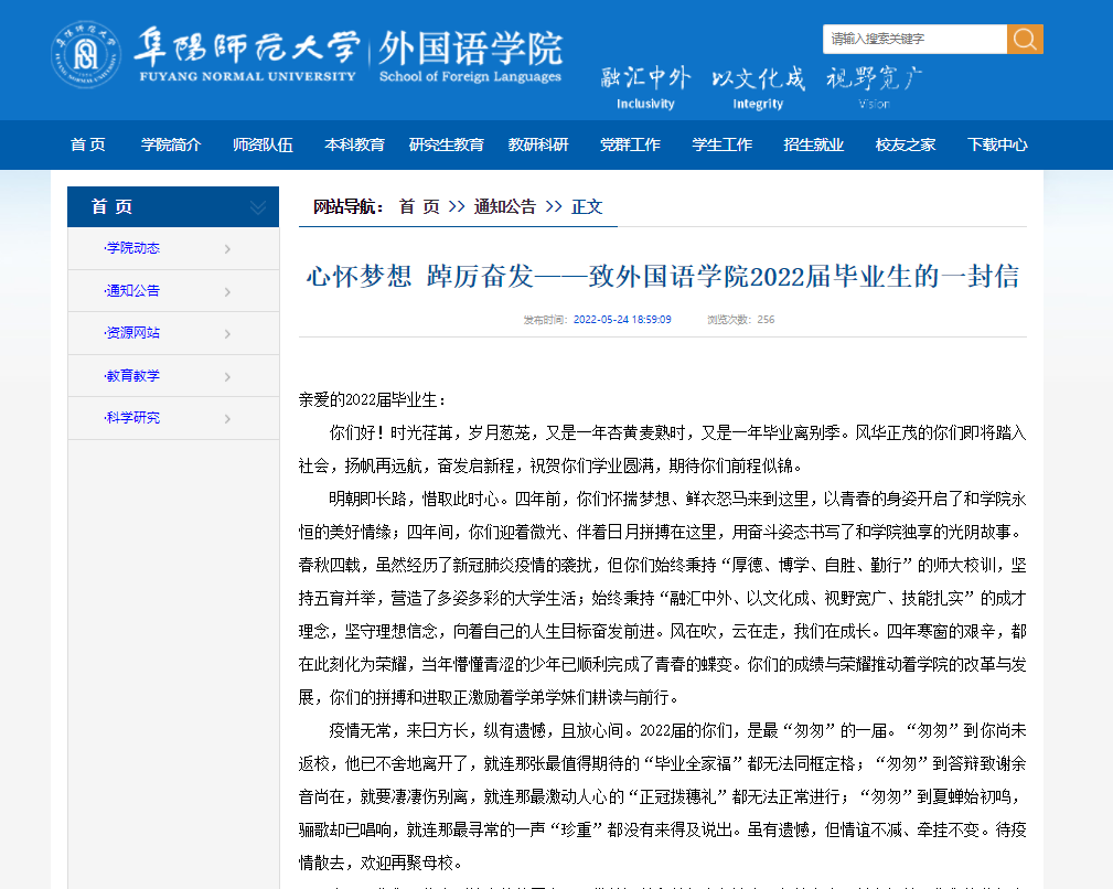 受疫情影响,2022届毕业生缺少了往届毕业季的喧闹,备受期待的毕业典礼也无法线下集中举行。为弥补遗憾,学院精心策划撰写,通过学院网站、微信公众号及时发布致毕业生的一封信,将四载日月浓缩为只言片语,将真情祝福融汇在字里行间,将殷殷期待寄托在云端线上。纸短情长,载满回忆、饱含深情,勉励广大全体毕业生牢记“师大人”的身份、“外院人”的印迹,秉承“师大精神”,心怀梦想、踔厉奋发,乘风破浪、笃志前行,在盛世伟业中成就自我,为实现中华民族伟大复兴中国梦贡献青春智慧。