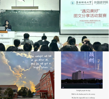 遇见美好,图文喜分享。 11月中旬,外国语学院分初赛、复赛两个阶段举办了外语图文分享活动,分享生活的美好,传递奋斗的力量。经过激烈角逐,2021级日语1班学生陈曼斩获一等奖,她用中、日、英、韩四种语言讲述了图片背后的故事,用眼睛去发现身边的动人风景,用心灵去感受生活的美好时刻。
