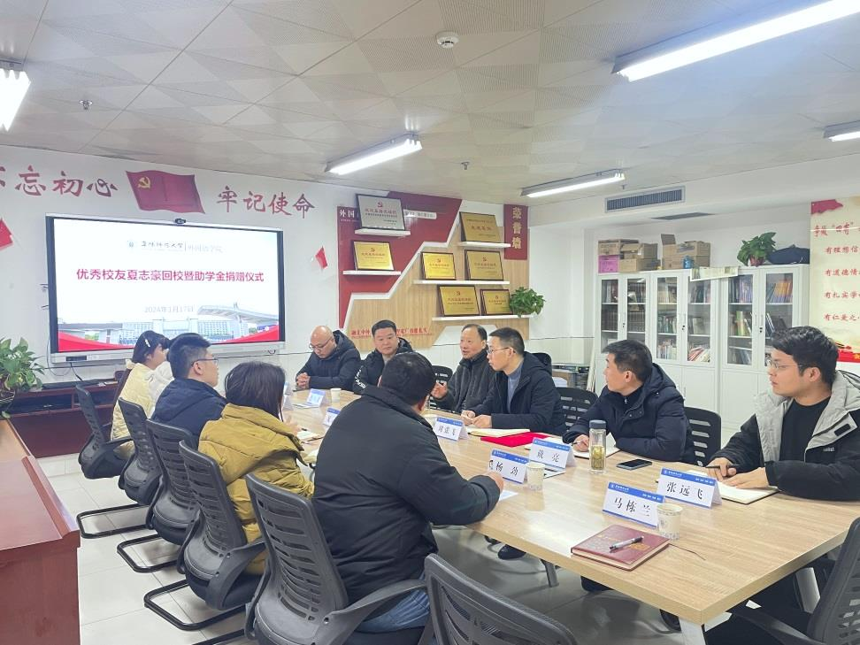1月17日,江苏电力设计院驻尼日利亚项目部经理、外国语学院2016届毕业生夏志豪回校并向家庭经济困难学生捐赠助学金。校友工作办公室主任李国强、学生处副处长吴雪影、团委副书记杨劲、外国语学院党政领导、受资助学生辅导员及受资助学生参加捐赠仪式。仪式由学院党委书记刘张飞主持。