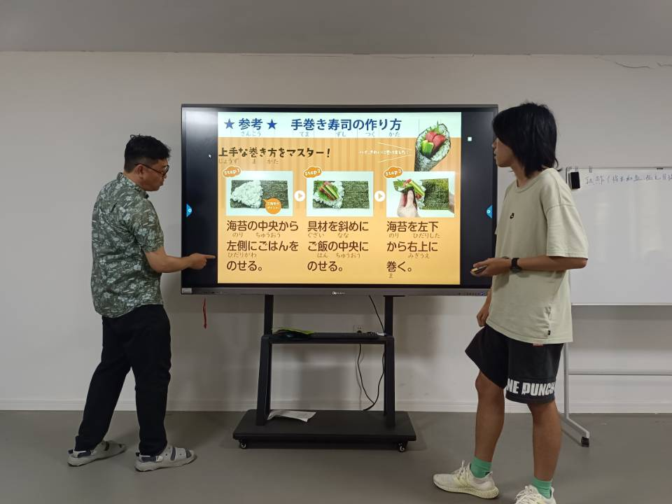 本次授课,佐藤匠趣味性地以“寿司制作”为主题,在介绍日本寿司种类、寿司制作材料、寿司制作方法的同时,为学生进行相关日语单词讲解及日语口语训练。在授课同时,三位日语专业学生进行实时翻译,既帮助其他学生更好的吸收和理解教学内容,也锻炼了学生的日语口语表达能力。授课过程中同学们踊跃发言,积极回答问题,课堂气氛活跃,教学效果显著。