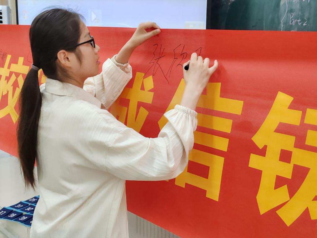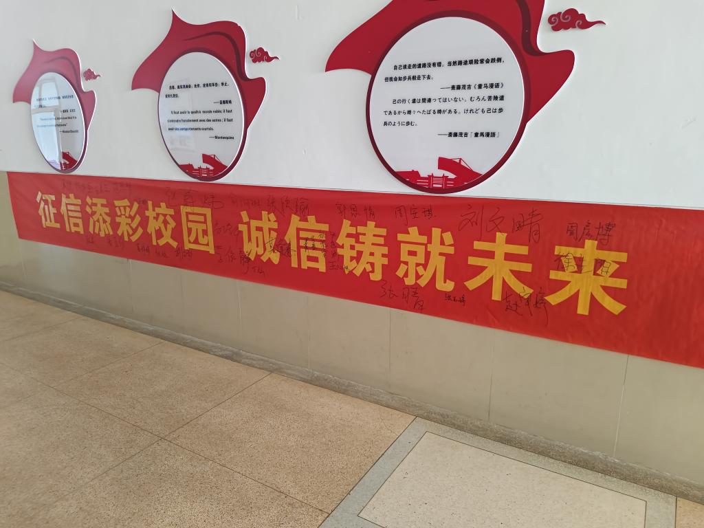 诚信签名,培养诚信品质。6月11日,学院开展“征信添彩校园 诚信铸就未来”诚信签名活动。在庄重而热烈的氛围中,同学们郑重地在横幅上签下自己的名字,每一个签名都代表着一个对诚信的坚定承诺,并表示在未来的学习和生活中,要时刻牢记诚信原则,以诚信为基石,做一个有道德、有责任、有担当的新时代青年。