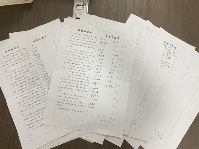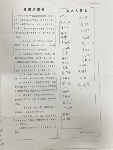 诚信承诺,表明守信决心。6月6日,学院以高考、期末考试和宿舍晚考勤为契机,举办诚信承诺书签署活动。学院学生全员参与,郑重签署诚信承诺书,承诺做到学习诚信、生活诚信、考试诚信、诚信缴费、诚信贷款、诚信受助、诚信就业、诚信上网。《诚信承诺书》的签订表明了学生坚决做到诚实守信的决心,引导学生争做诚实守信的文明大学生,营造以诚信为荣的校园文化氛围。
